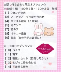 せっかく出会えたご縁を大切にしたいので忘れられないような快感と甘い時間を一緒に過ごしたいです。 ------------------------------------------------------------------------ CLASS EXECTIVE 60分¥12,000 90分¥18,000 120分¥24,000 延長30分 ¥10,000 |